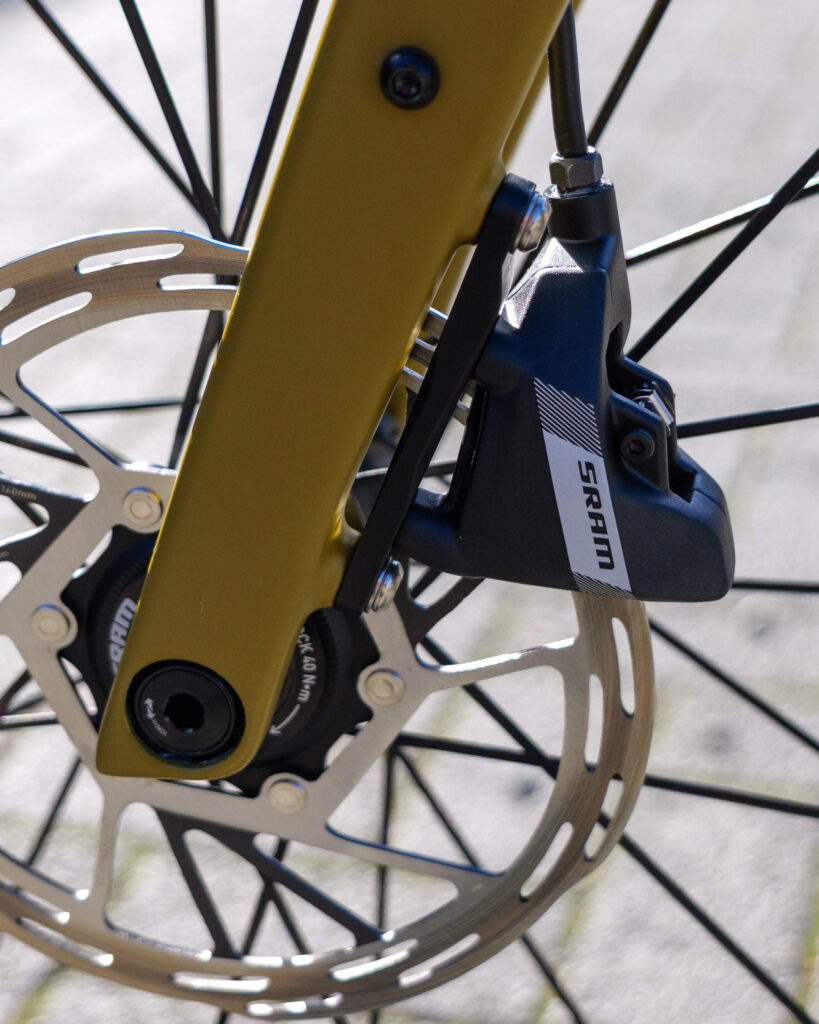 Gebremst wird zuverlässig mit hydraulischen SRAM Apex AXS Scheibenbremsen und SRAM Paceline Bremsscheiben – für volle Kontrolle auch bei Nässe und Abfahrten.